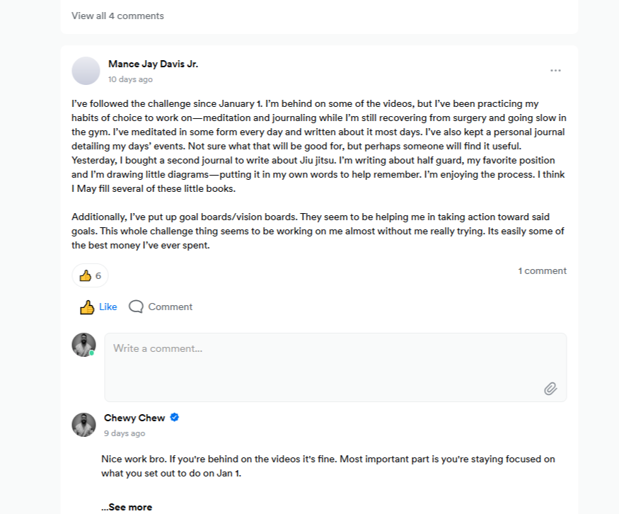 I would tell you that 1 of the best parts about the Executors Challenges the last 2 years has been the community area where we can chat regularly and communicate. And if you choose the Chewjitsu Inner Circle membership, you'll also get access to direct & group coaching from me which includes: